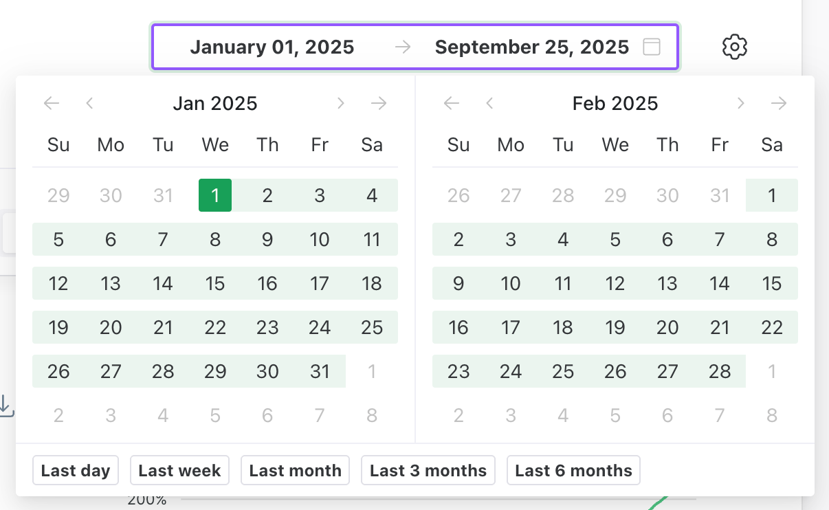 レポートを開いた後に、カレンダードロップダウンから新しい開始日と終了日を選択することで、期間を変更できます。