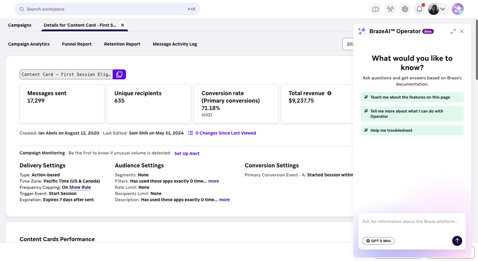 - コンテキストに依存します。オペレータは、Braze でどのページを使用しているかを認識します。最も適切な結果を得るために、操作しているページでOpen Operator を開きます。