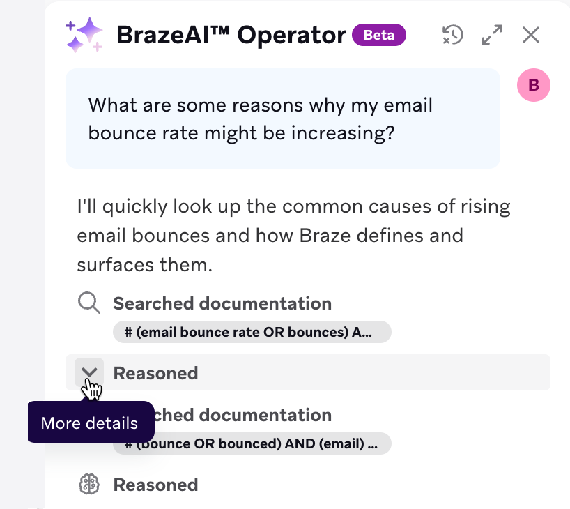 オペレータは、ステップごとの指示、Braze文書へのリンク、およびプレーン言語の説明を提供できます。質問がより明確で具体的になればなるほど、回答はより有用となる。