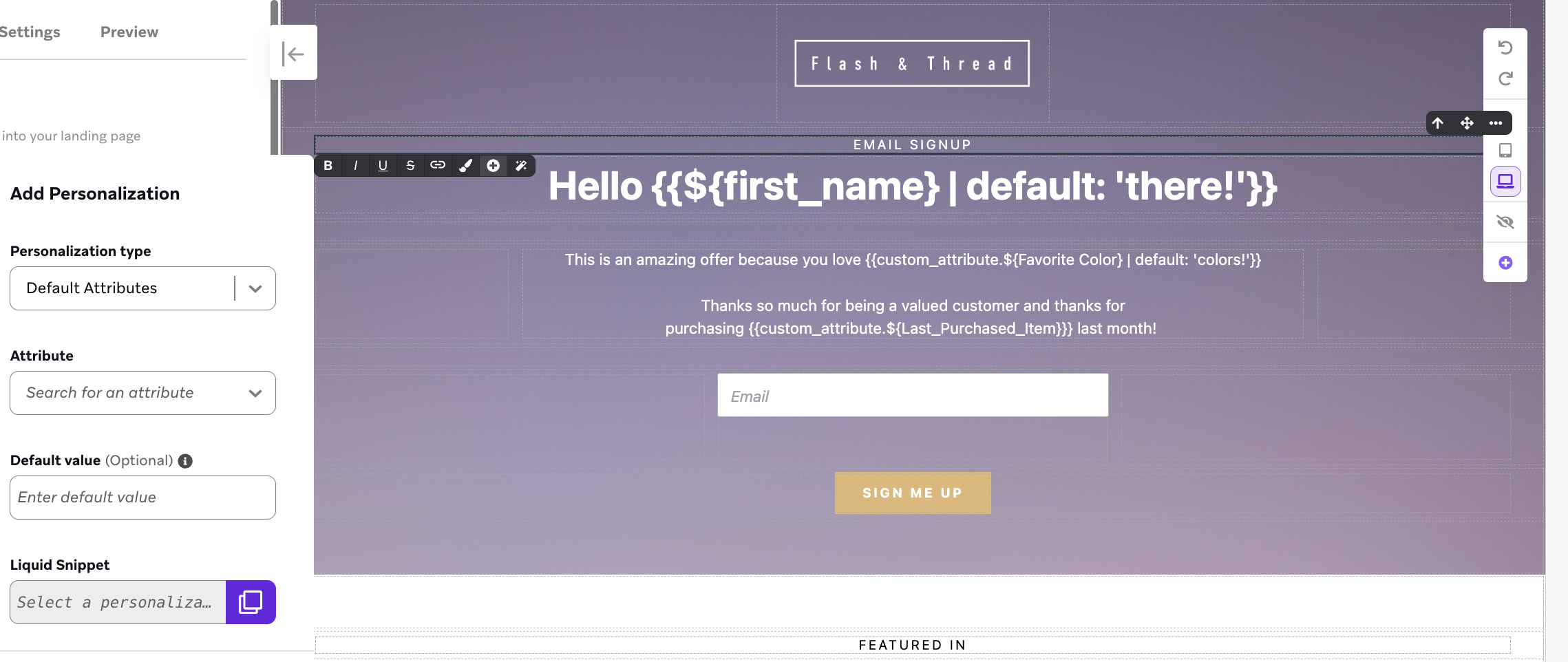 ドラッグアンドドロップエディターでは、エディターと右側のパネルのページまたはブロック 設定s の両方に、リキッドパーソナライゼーションを挿入できます。Liquid の実装方法については、専用のLiquid ドキュメント をご覧ください。