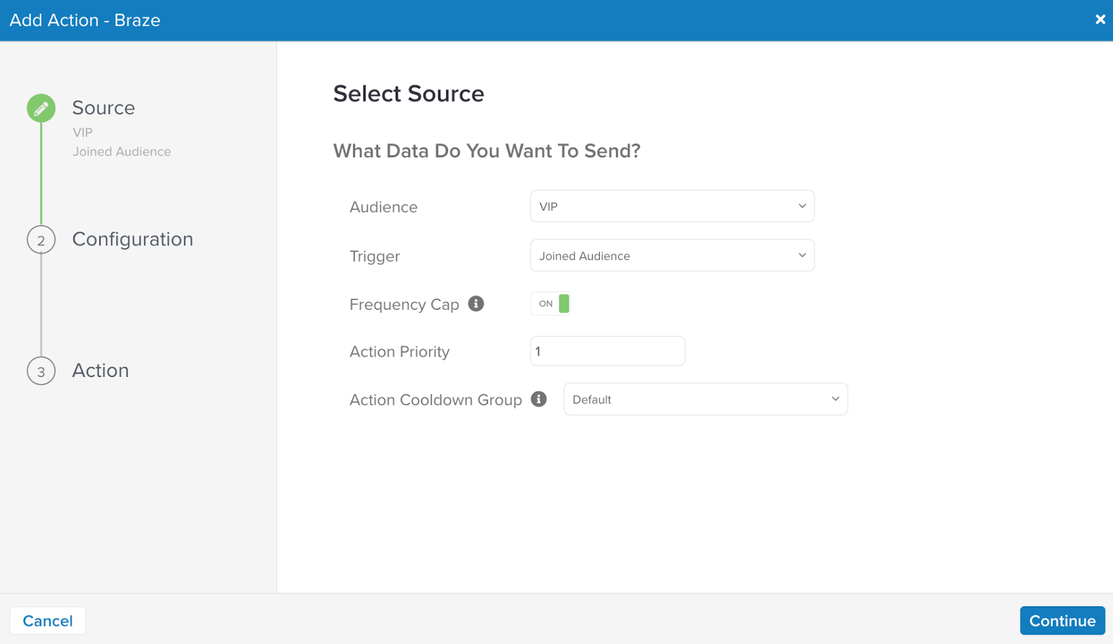 In the Source dialogue that appears, select the audience you created in the previous step and a trigger that you feel is appropriate for your situation. You also can toggle on the frequency cap to control how often this action triggers.