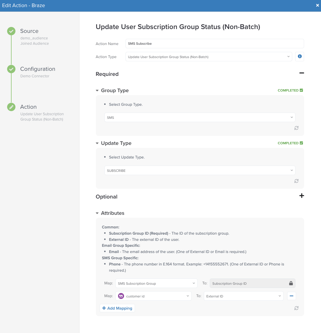 Attributes | - Subscription group ID (required): The ID of the subscription group related to the group type mapped in the preceding field. - External ID: The external ID of the user. Email group specific: - Email: The email address of the user. If the external ID is not defined, the email will be required. SMS group specific: - Phone: The phone number in E.164 format. For example, +14155552671. If the external ID is not defined, the phone will be required. |
