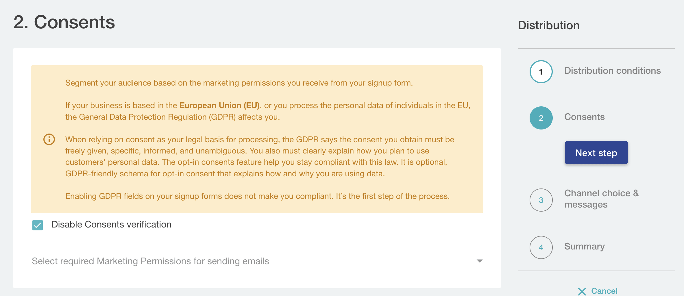 Next, add marketing permissions. If you don’t collect permissions from your audience, disable the consent verification.
