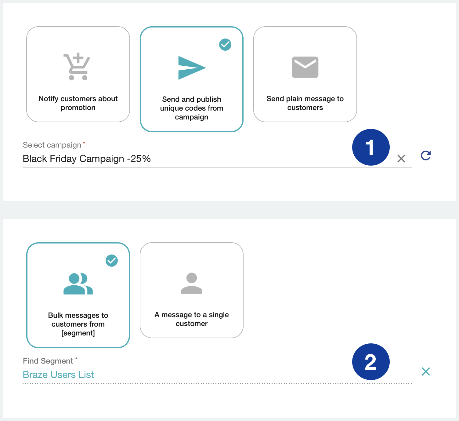 Choose a campaign that will be a source of unique codes (1) and select a segment of users or a single customer as your receivers (2). Visit Voucherify to learn more about customer segments.
