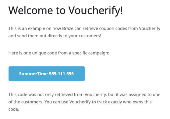 In this use case, the Connected Content script calls Voucherify API to publish a unique coupon code and send it in the Braze message. Each Braze user receives only one unique code.