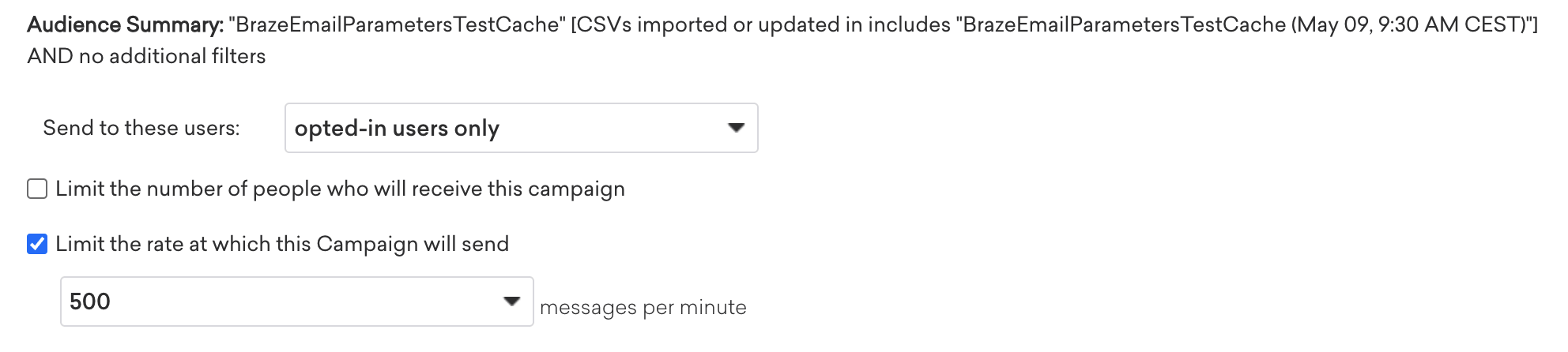 Ensure that you limit the number of messages sent by Braze per minute. This secures both Braze and Voucherify APIs against hitting too much traffic from your campaign. When targeting users during campaign setup, limit the sending rate to 500 messages per minute.