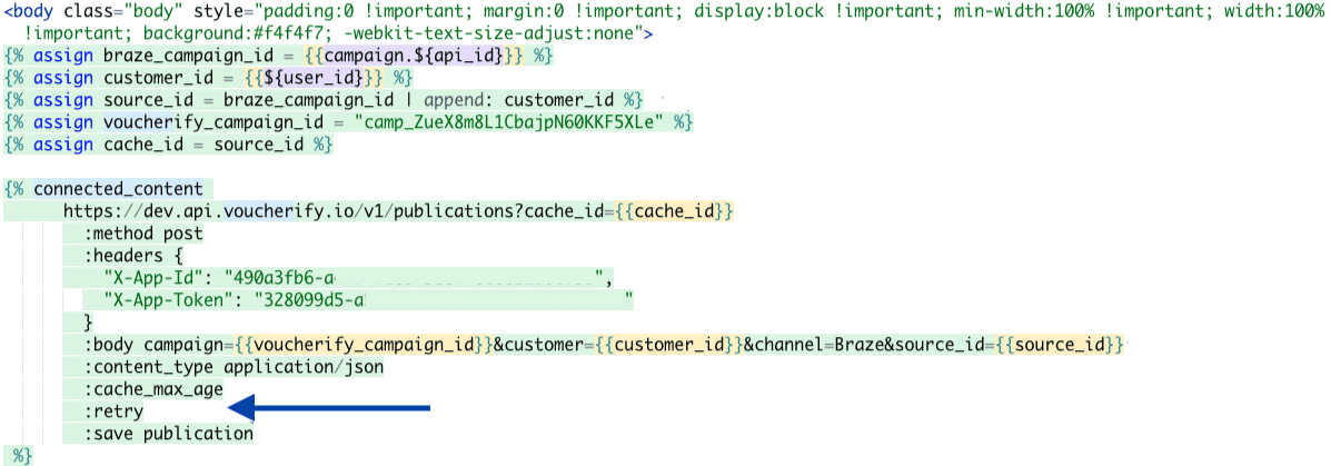 {% connected_content YOUR-API-ENDPOINT/v1/publications?cache_id={{cache_id}} :method post :headers { "X-App-Id": "VOUCHERIFY-APP-ID", "X-App-Token": "VOUCHERIFY-APP-TOKEN" } :body voucher={{prefix}}{{phoneNumber}}&customer={{customer_id}}&channel=Braze&source_id={{source_id}} :content_type application/json :cache_max_age :save publication :retry %}
