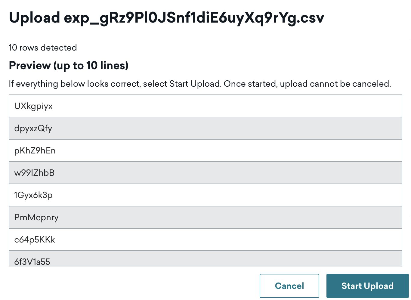 Confirm that the list only contains codes (not column header) and click Start Upload. When the import is done, click Save List to confirm the list details.