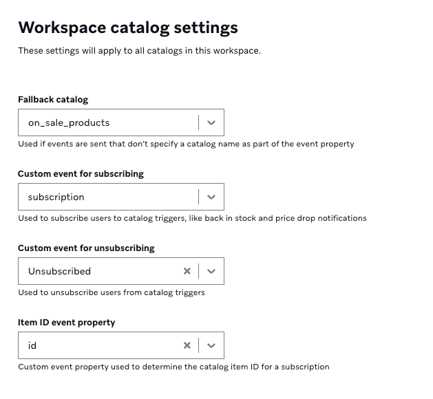 | 대체 카탈로그 | 커스텀 이벤트에 catalog_name 속성이 없는 경우 구독에 사용되는 카탈로그입니다. |