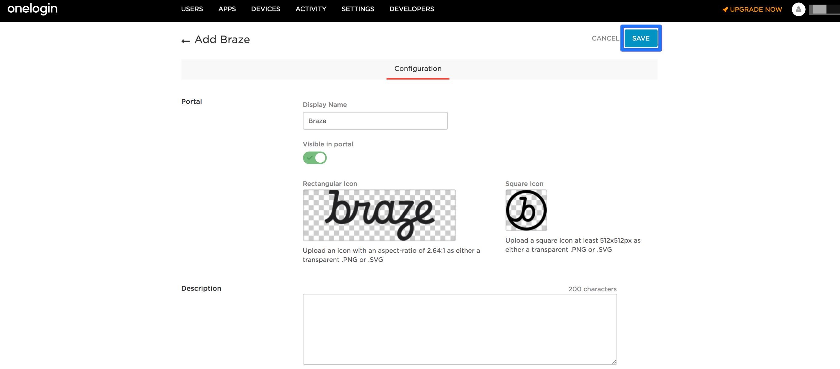 | Domínio Braze | Você precisará de seu domínio Braze para configurar o Braze no OneLogin. Se a sua instância for US-01, será necessário inserir o URL do painel no painel do OneLogin. Por exemplo, se o URL do seu dashboard for https://dashboard-01.braze.com, você precisará inserir dashboard-01.braze.com. |