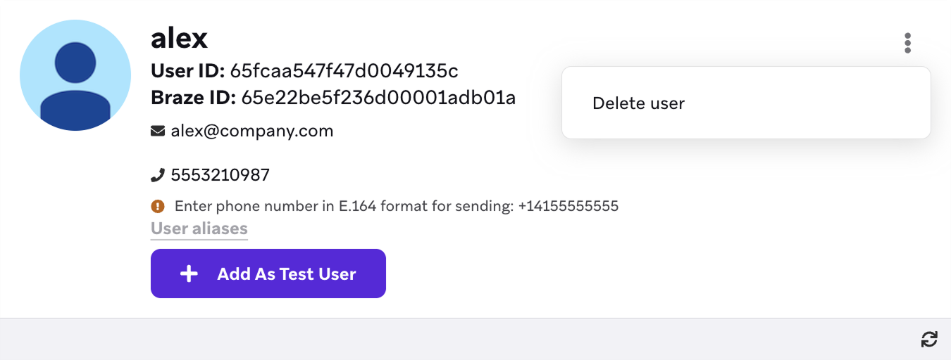 Na página de perfil do usuário, selecione Mostrar opções > Excluir usuário. Lembre-se de que pode levar alguns minutos para que o usuário seja totalmente excluído no Braze.