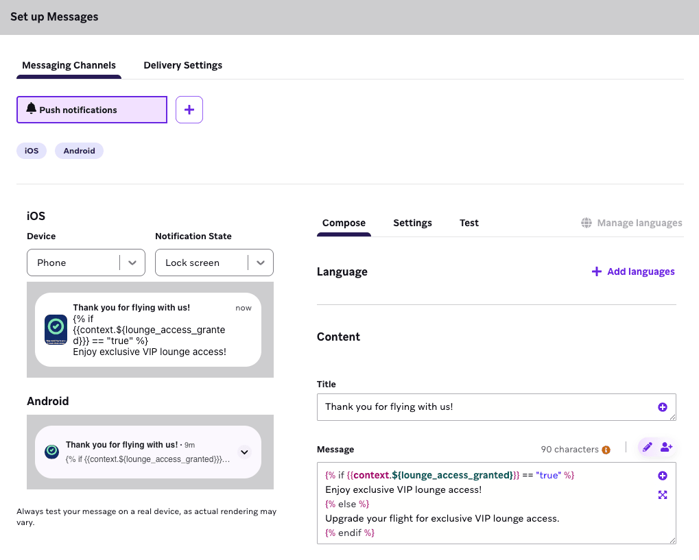 Em seguida, criaremos uma etapa de mensagem para direcionar os usuários onde {{context.${lounge_access_granted}}} é true. Essa mensagem será uma notificação por push que inclui informações personalizadas sobre o lounge. Com base nessa variável de contexto, os passageiros qualificados receberão as mensagens relevantes antes de seu voo.