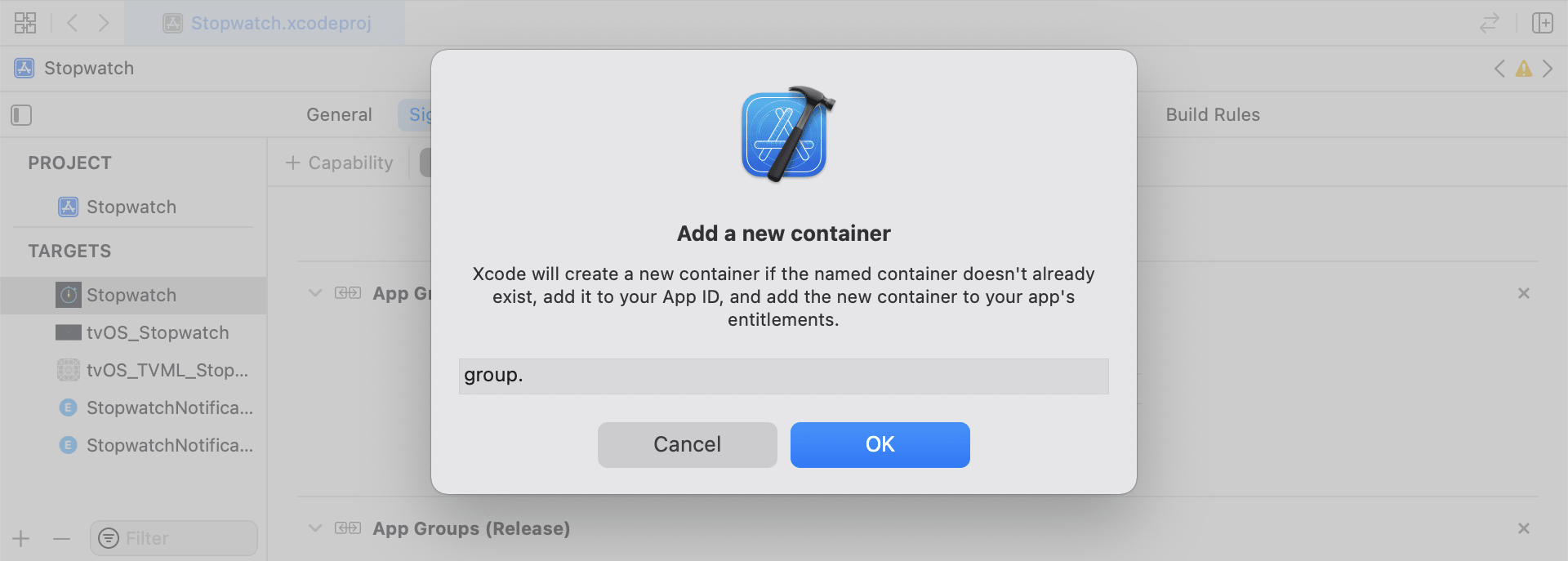 Añade una capacidad App Groups. Si no tienes ningún grupo de aplicaciones en tu aplicación, ve a la capacidad del objetivo principal de la aplicación, activa el App Groups, y haz clic en el “+”. Utiliza el ID del paquete de tu aplicación para crear el grupo de aplicaciones. Por ejemplo, si el ID del paquete de tu aplicación es com.company.appname, puedes llamar a tu grupo de aplicaciones group.com.company.appname.xyz. Asegúrate de que App Groups está activado tanto para el destino principal de tu aplicación como para el destino de la extensión de contenido.