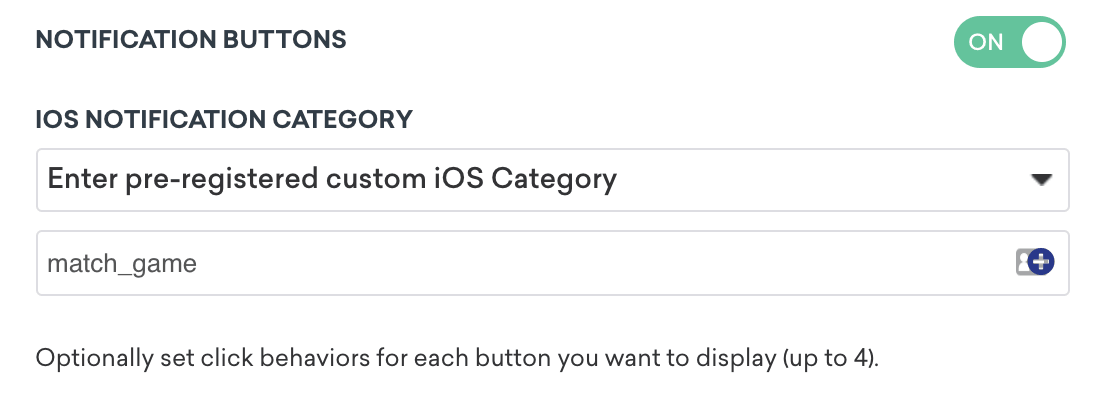 Para configurar una vista personalizada en el panel, debes alternar los botones de notificación e introducir tu categoría personalizada. La categoría personalizada de iOS prerregistrada que proporciones se cotejará con la UNNotificationExtensionCategory en la página .plist de tu objetivo de extensión de contenido de notificaciones. El valor dado aquí debe coincidir con el establecido en el panel Braze.