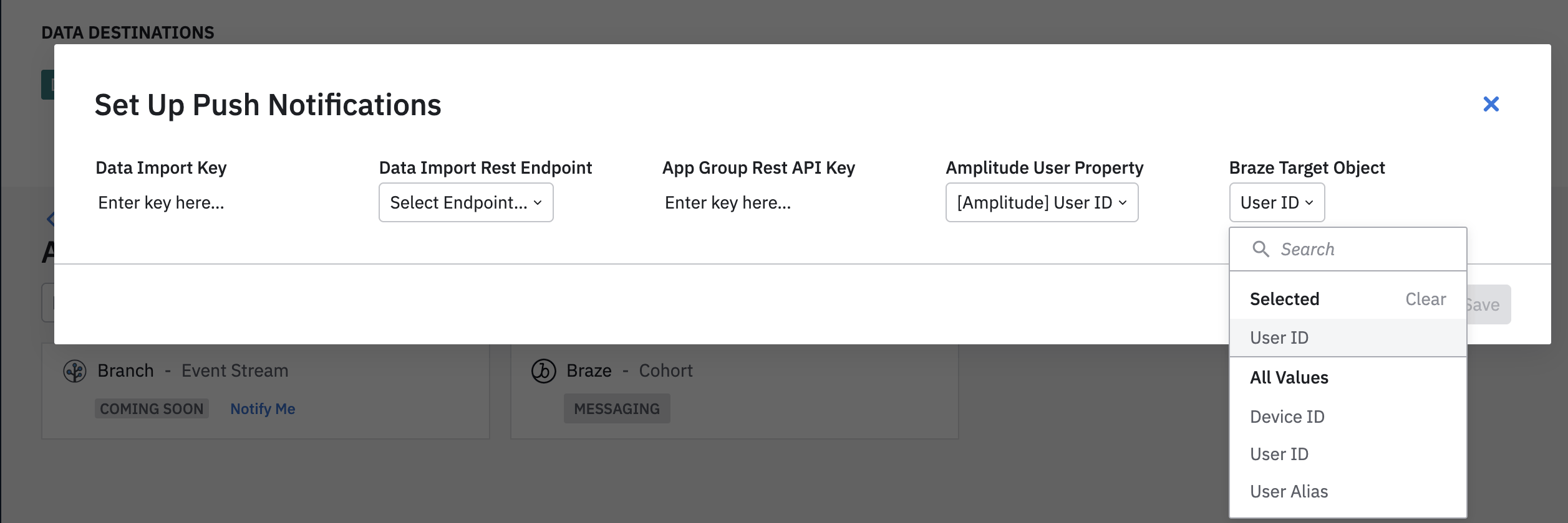 En Amplitude, ve a Fuentes & Destinos > [nombre del proyecto] > Destinos > Braze. En el mensaje que aparece, proporciona la clave de importación de datos Braze y el punto final REST, y haz clic en Guardar.