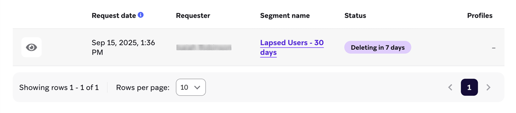 Para más detalles sobre una solicitud concreta, selecciona para mostrar los detalles del registro de borrado. Aquí también puedes cancelar las eliminaciones de segmentos pendientes.