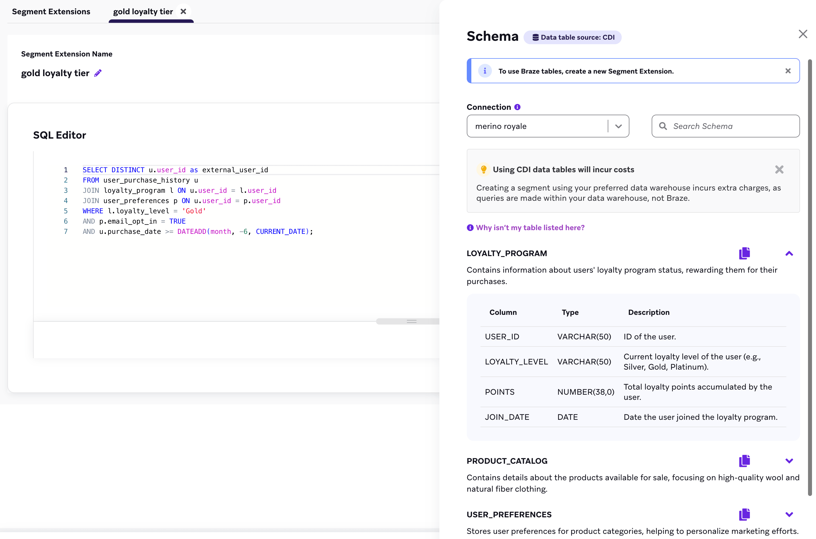 Para utilizar los datos de su almacén de datos para la segmentación dentro de su espacio de trabajo Braze, tendrá que crear una fuente conectada y, a continuación, crear un segmento CDI dentro de sus extensiones de segmento. Las extensiones de segmento CDI te permiten escribir SQL que realiza consultas directas a tu propio almacén de datos utilizando los datos disponibles a través de tus conexiones CDI, y crear un grupo de usuarios a los que puedes dirigirte dentro de Braze.