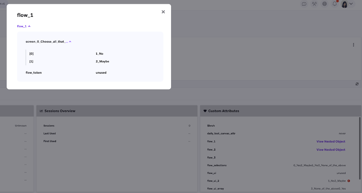 Después de que Braze reciba una respuesta de Flujo, guardaremos el atributo personalizado anidado con la denominación prescrita en el perfil de usuario. Ese atributo personalizado puede extraerse al crear Lienzos.
