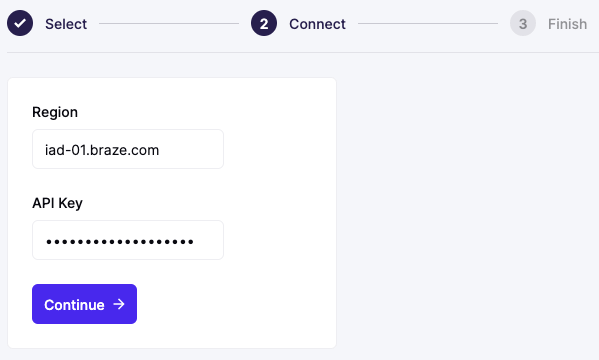 - Indiquez votre endpoint REST Braze (à l’exclusion de “https://rest.”) et votre clé API REST Braze.