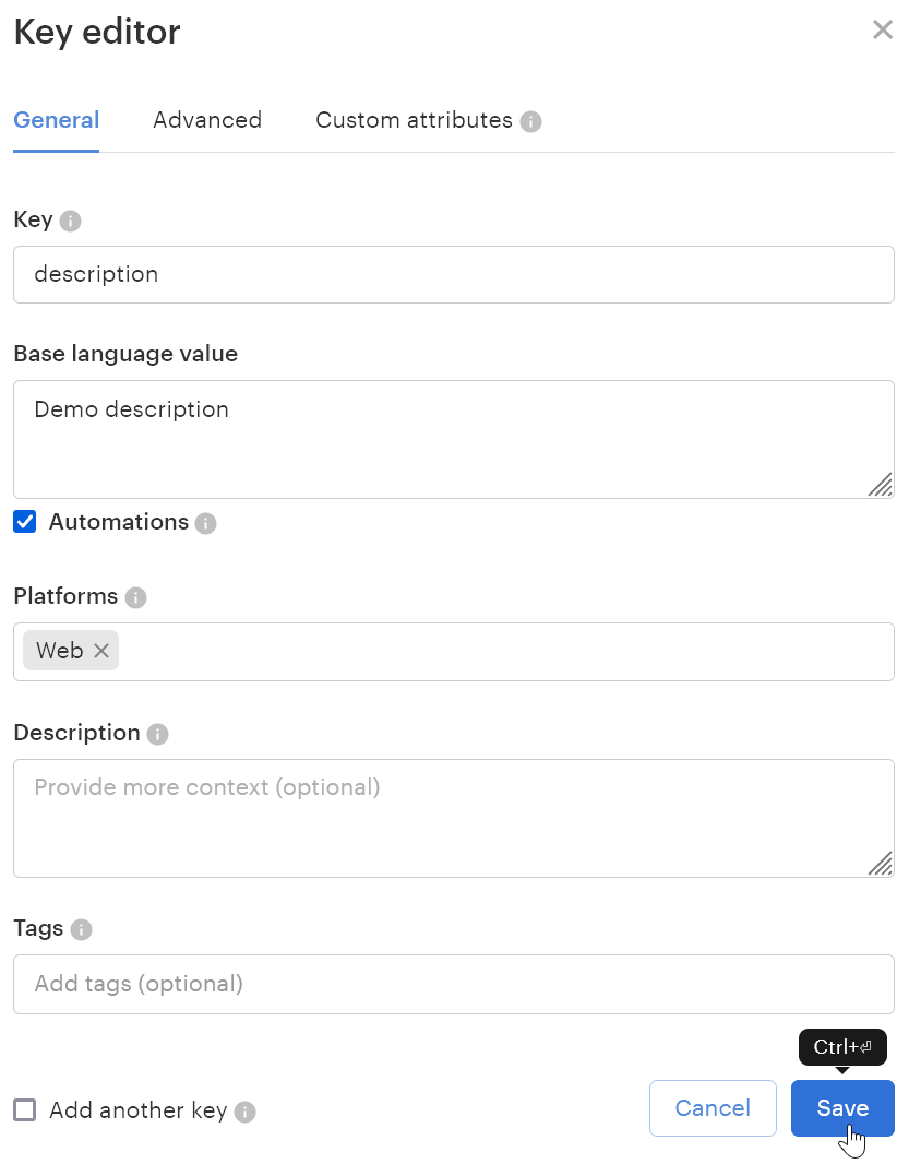 - Ouvrez votre projet Lokalise, cliquez sur Ajouter une clé, entrez “description” dans le champ Clé.