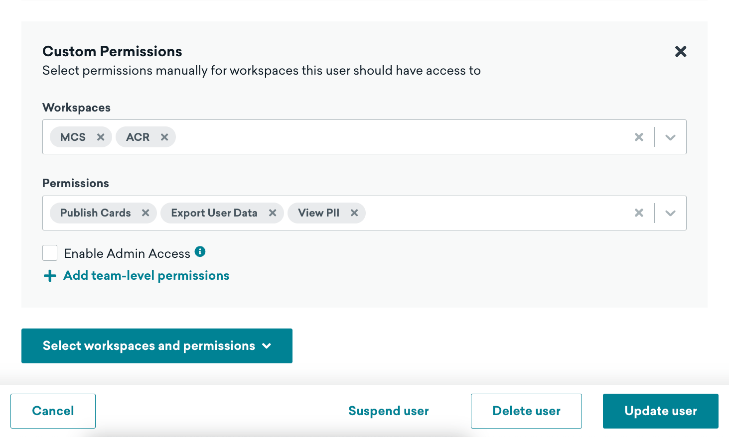 Vous pouvez donner à un utilisateur des autorisations différentes pour chaque espace de travail auquel il appartient dans Braze. Pour gérer leurs autorisations au niveau de l’espace de travail, sélectionnez Sélectionner les espaces de travail et les autorisations, puis choisissez manuellement leurs autorisations pour sélectionner ou attribuer un ensemble d’autorisations que vous avez précédemment créé.