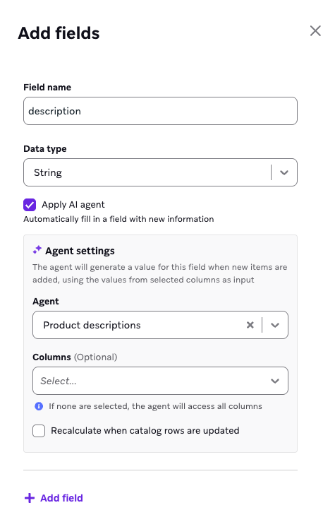 Vous pouvez appliquer un agent aux champs du catalogue afin qu’il génère ou calcule automatiquement des valeurs pour chaque ligne. L’agent s’exécutera également sur les nouvelles lignes qui seront ajoutées au catalogue à l’avenir.