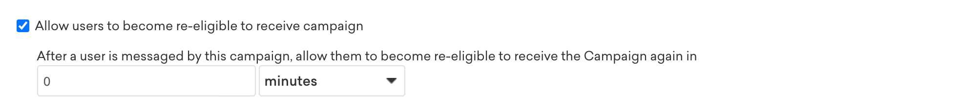 Le nombre de fois où un utilisateur reçoit une campagne déclenchée par API peut être limité en utilisant des paramètres de rééligibilité. Cela signifie que l’utilisateur recevra la campagne une seule fois ou une seule fois dans une période donnée, indépendamment du nombre de fois où le déclencheur API est activé.