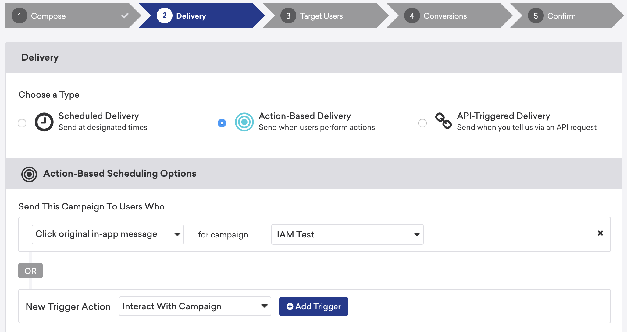 - Sélectionnez la réception/distribution basée sur l’action et ajoutez le déclencheur “Interagir avec la campagne” pour cibler les utilisateurs qui interagissent avec une campagne active.