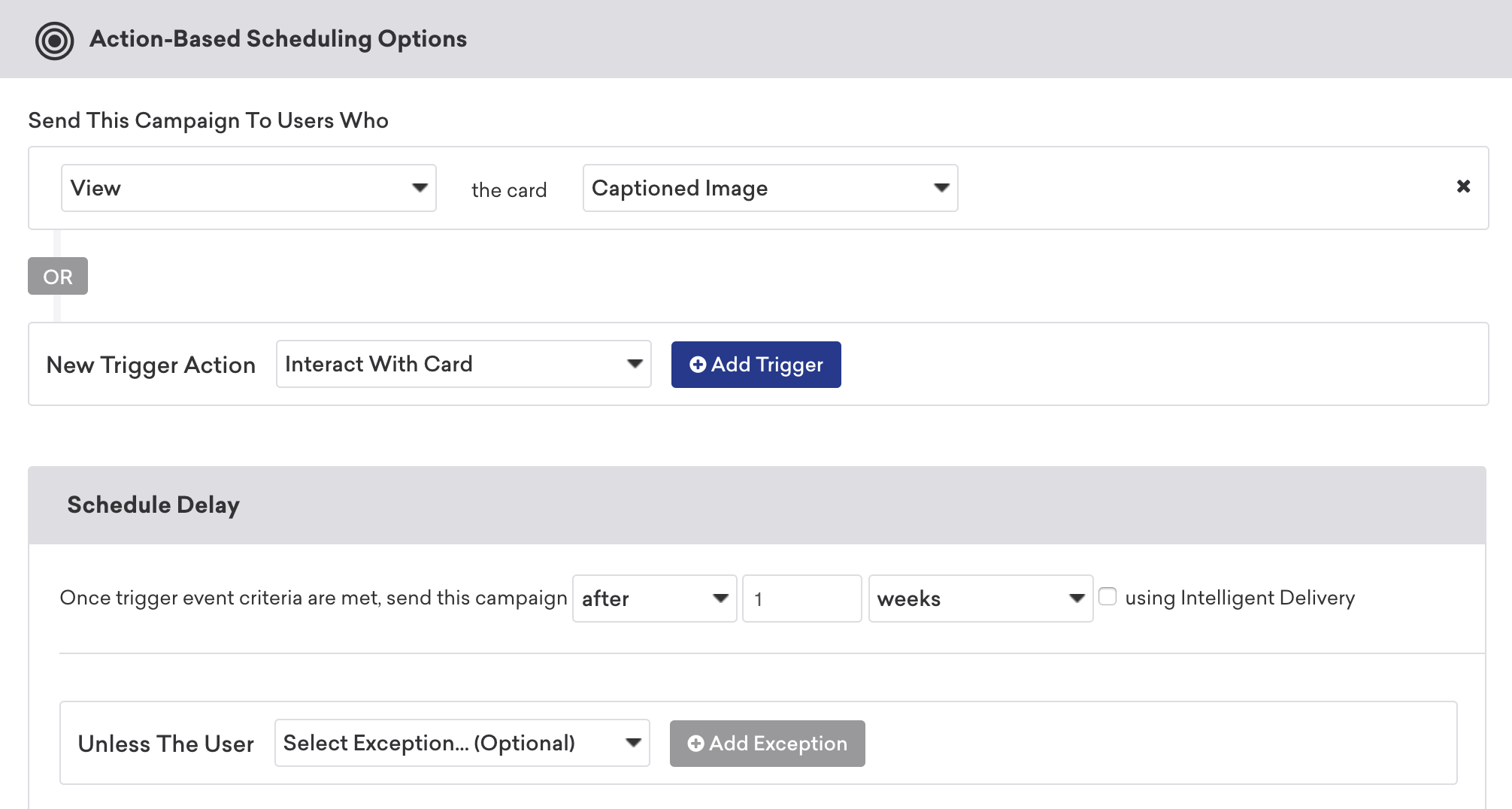 Si vous choisissez de définir un délai de planification, vous pouvez ajouter une exception à l’action de déclenchement. Par exemple, vous pouvez désirer renvoyer une campagne e-mail aux utilisateurs qui n’ont pas ouvert l’e-mail d’origine. Dans ce scénario, vous pouvez choisir « Recevoir un e-mail » comme déclencheur et définir un délai de planification d’une semaine. Ensuite, vous pouvez ajouter « Ouvrir l’e-mail » en tant qu’exception. Vous allez maintenant renvoyer l’e-mail aux utilisateurs qui n’ont pas ouvert l’e-mail d’origine dans la semaine qui suit la réception.