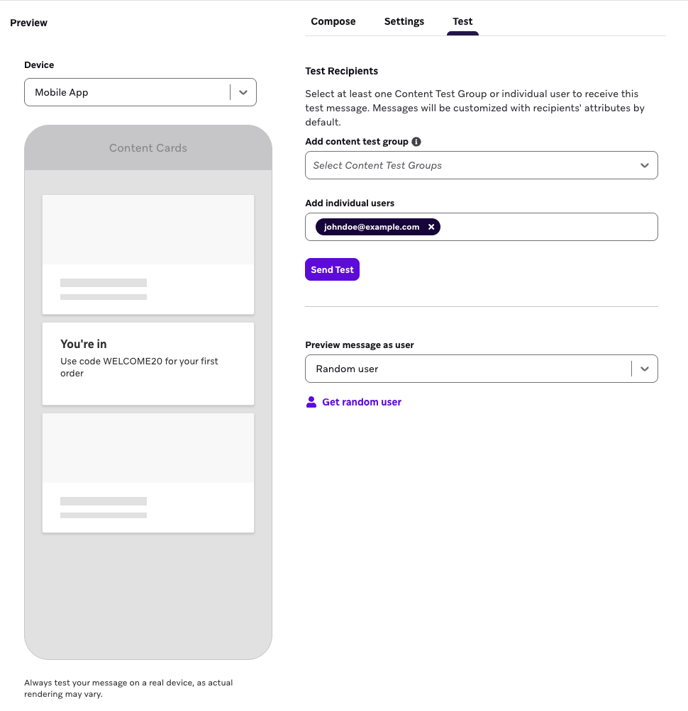 - Sélectionnez l’onglet Test et sélectionnez au moins un groupe de test de contenu ou un utilisateur individuel pour recevoir ce message de test.