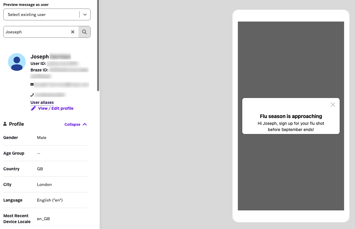 Si vous sélectionnez un utilisateur existant, saisissez l’ID ou l’e-mail de l’utilisateur dans le champ de recherche. Ensuite, utilisez l’aperçu du tableau de bord pour voir comment votre message apparaîtrait à cet utilisateur, et envoyez un message test à votre appareil qui reflète ce que cet utilisateur verrait.