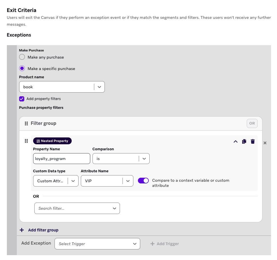 Vous pouvez exploiter la comparaison des filtres de propriétés avec des variables de contexte ou des attributs personnalisés dans ces actions de déclenchement : Réaliser un événement personnalisé et effectuer un achat. Ces déclencheurs d’action prennent également en charge les filtres de propriété pour les propriétés de base et les propriétés imbriquées.