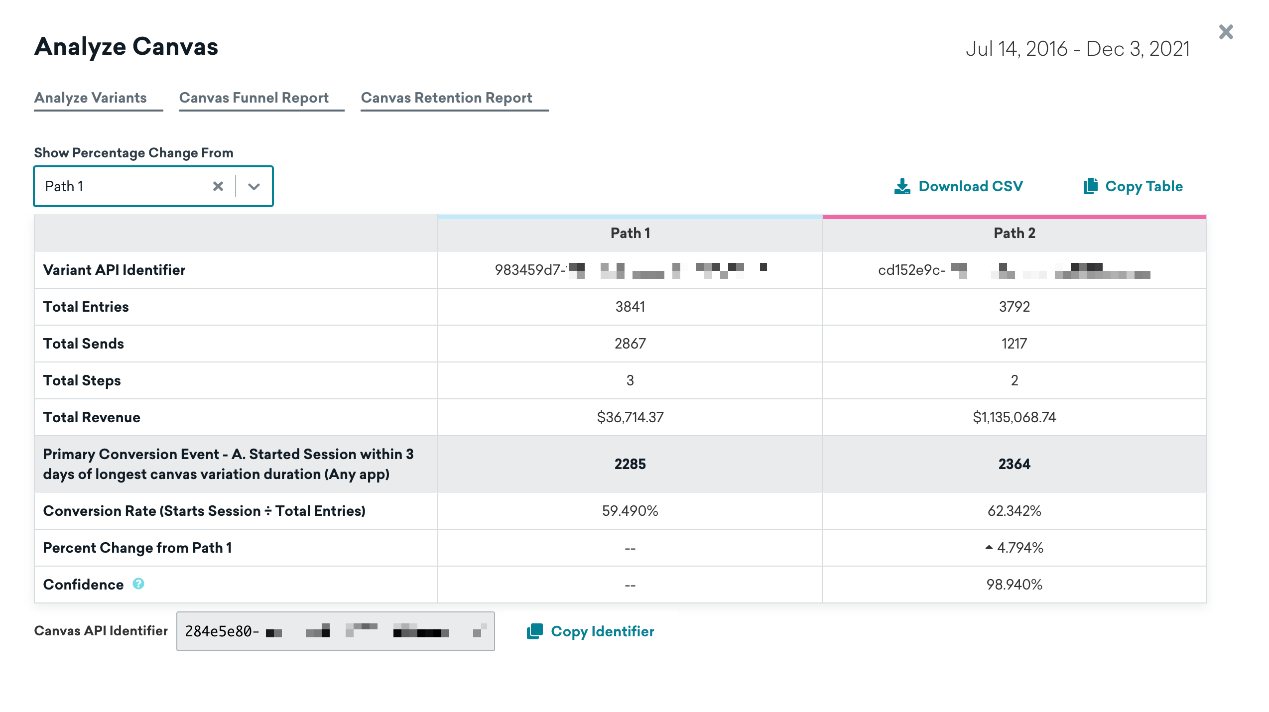 Dans l’onglet Analyser les variantes, vous pouvez voir une répartition des performances par variante et groupe de contrôle, si vous en avez plus d’un. Vous pouvez également copier l’identifiant API Canvas, télécharger un fichier CSV des indicateurs et copier les cellules. L’onglet Analyser les variantes contient un tableau qui vous montre une répartition de chaque variante à plusieurs niveaux.