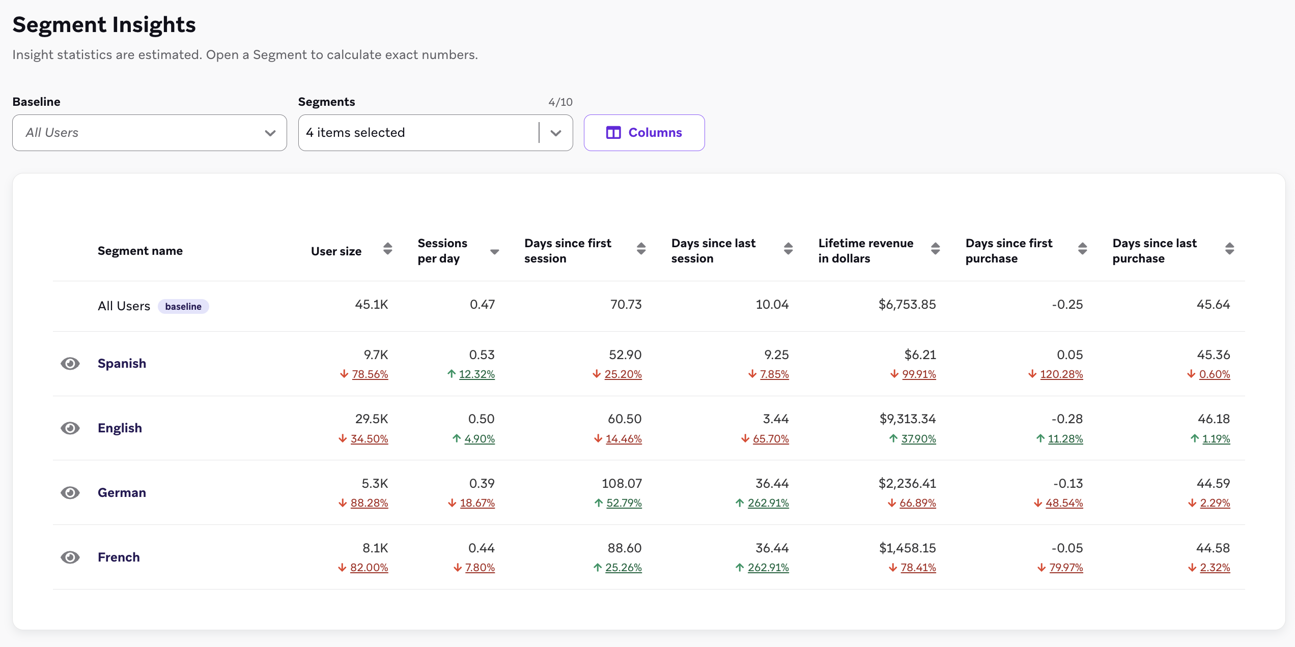Le segment de référence peut être soit un segment spécifique que vous sélectionnez, soit un segment contenant tous vos utilisateurs. Vous pouvez comparer les statistiques suivantes à l’aide de Segment Insights :