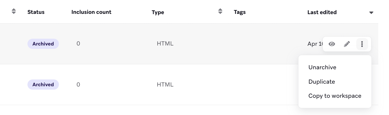 !Panneau des blocs de contenu enregistrés où le menu déroulant des paramètres pour “Test_32” est élargi pour afficher trois options : Désarchiver, dupliquer et copier dans l’espace de travail](/docs/fr/assets/img/unarchive-content-block.png?3fee5dd3783a4183d9b5c44d0b12bdbc)