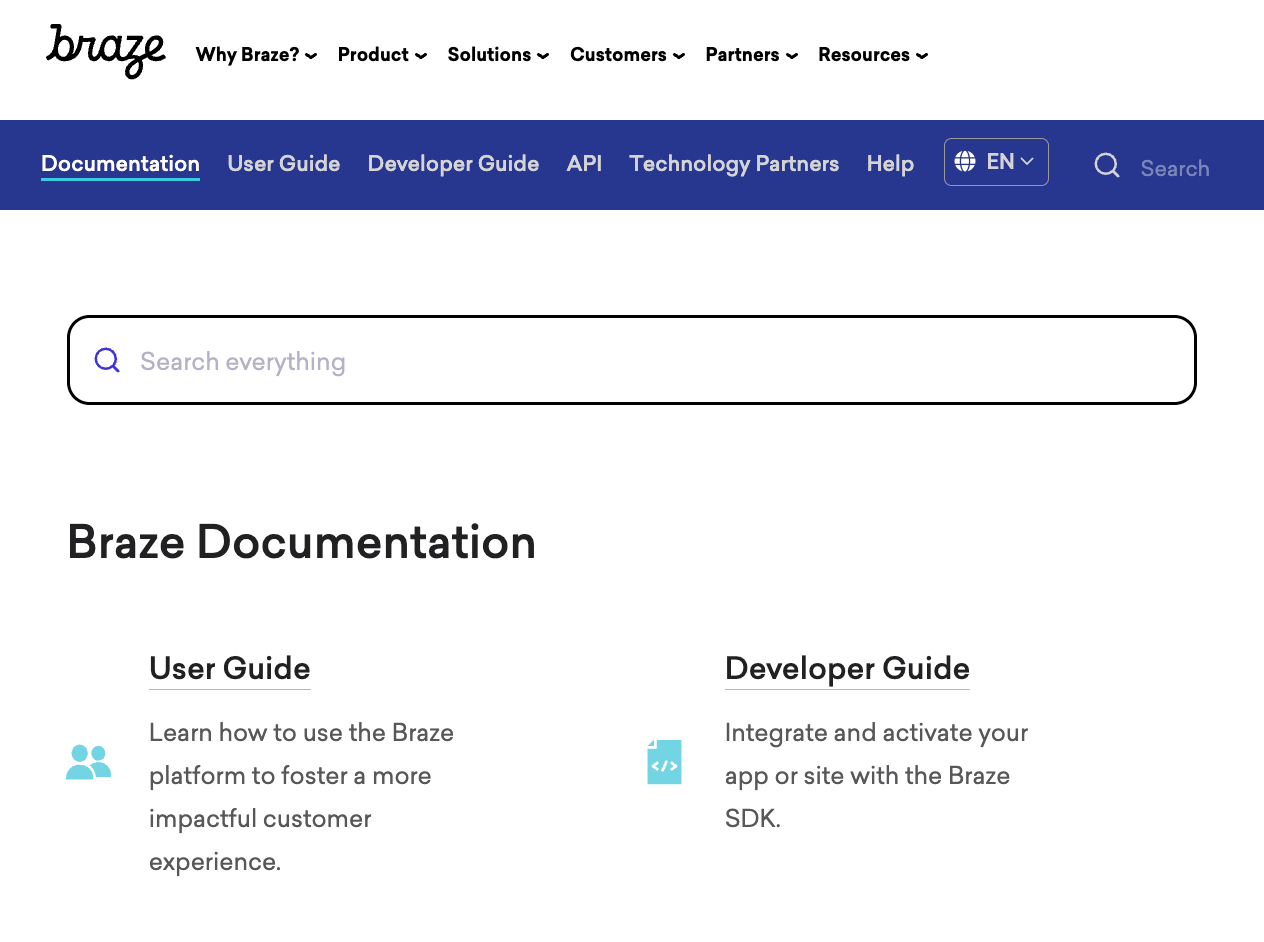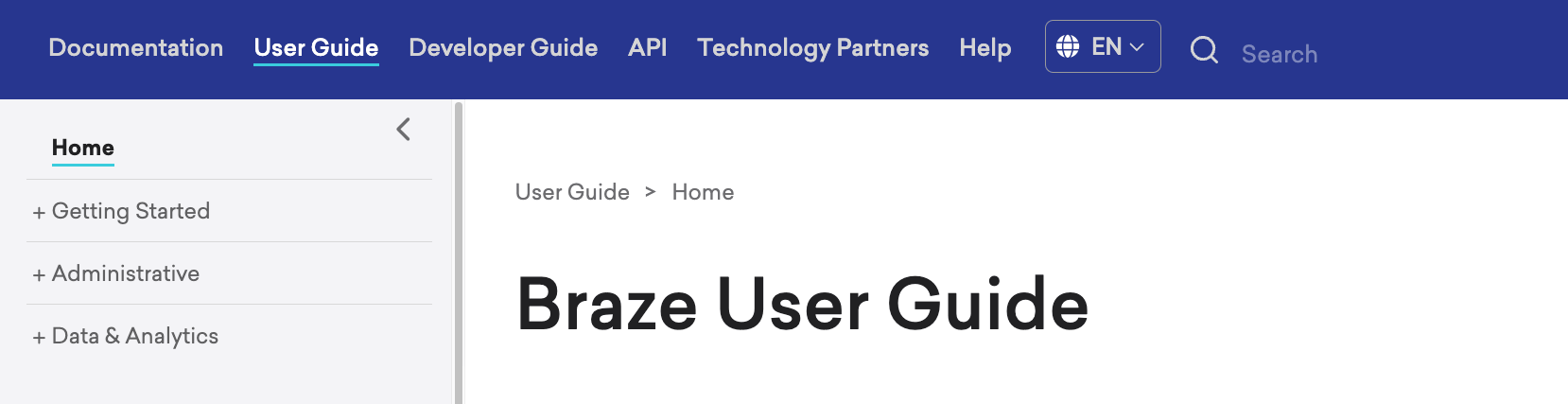 これらの主要セクションには、Braze Docsのどのページからでもサイトヘッダーからアクセスできます。