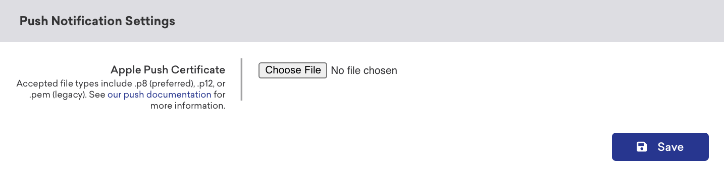 Braze ダッシュボードで既存のワークスペースに移動します。プッシュ通知設定 ngs で、プッシュ証明書ファイルを Braze ダッシュボードにアップロードして保存します。