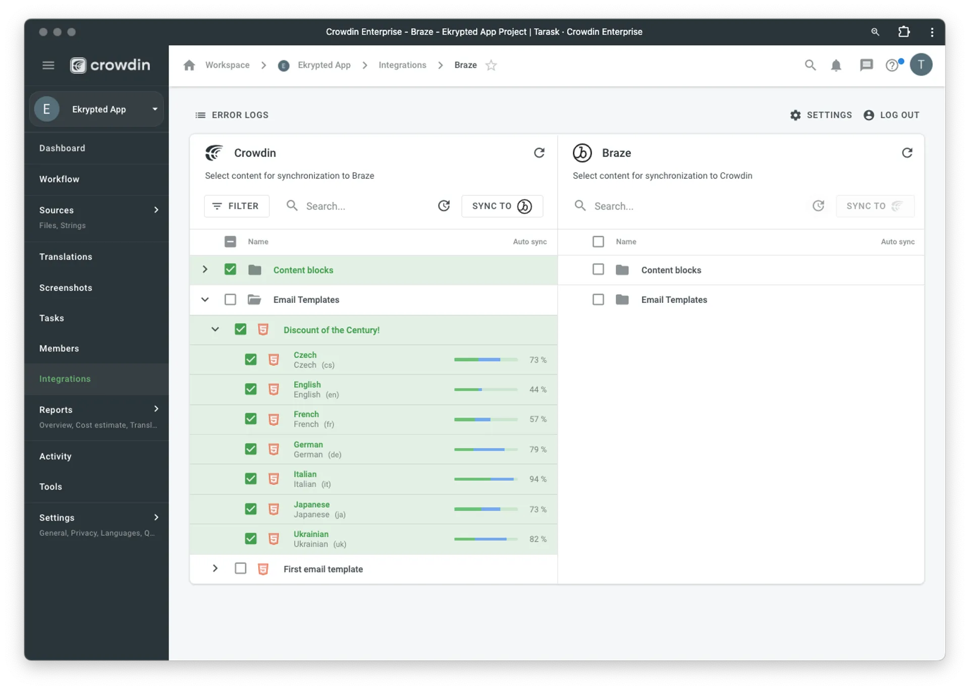 Braze と Crowdin の統合により、メールテンプレートとコンテンツブロックを翻訳できます。また、Braze アカウントから Crowdin プロジェクトにコンテンツを同期し、Braze に戻って翻訳を追加することもできます。