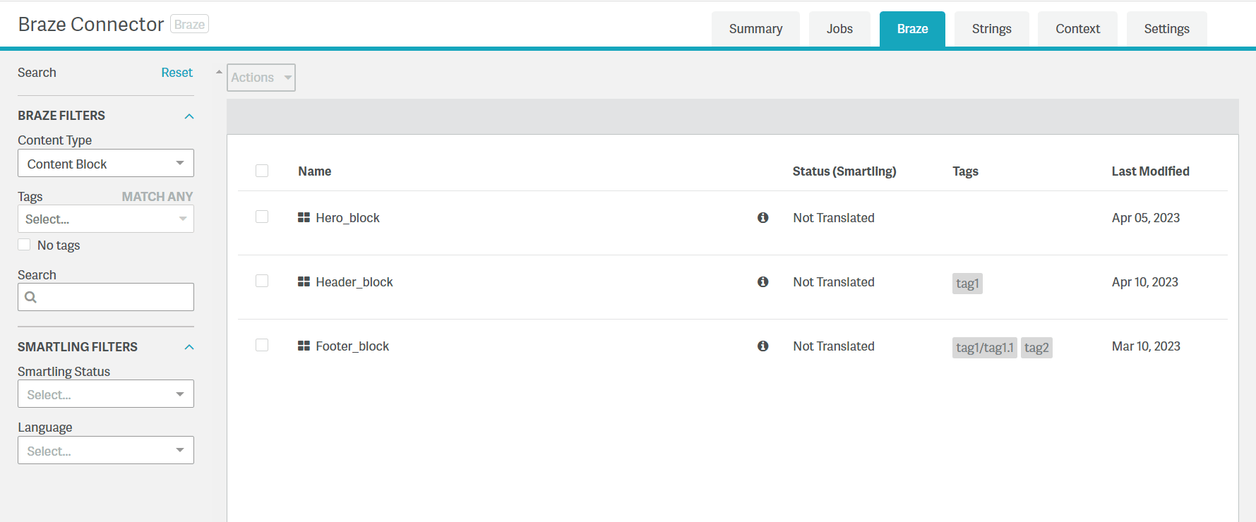 Brazeコネクターを接続して設定すると、スマートリングプロジェクトのBrazeタブにBrazeの内容が表示されます。詳細については、Smartling のドキュメントを参照してください。