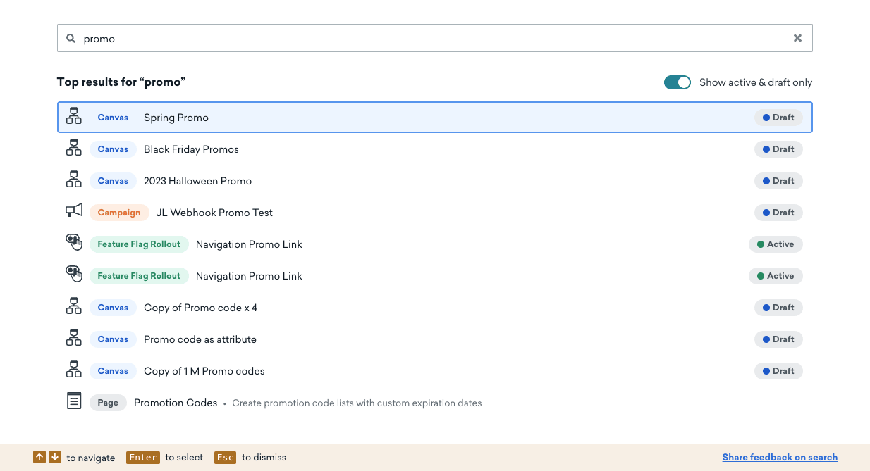 各検索結果には、結果のコンテンツタイプ (ページ、キャンペーン、キャンバス、セグメント、メールテンプレート) とステータス (アクティブ、アーカイブ済み、停止など) を示すタグが付いています。