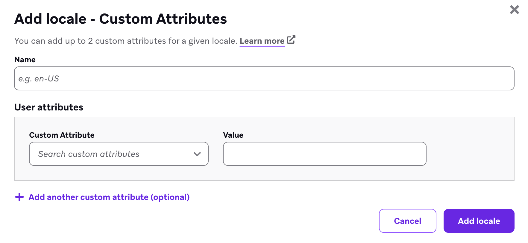 - 1つのロケールで最大2つのカスタム属性を選択できます。また、最大2つのデフォルトユーザー属性言語を選択できます。どちらの場合も、2番目の属性はオプションです。