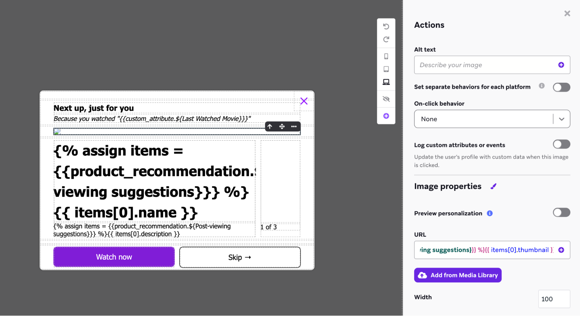 Last Watched Movieのカスタム属性をテンプレート化し、このレコメンデーションがユーザーの視聴履歴に基づくものであることをユーザーに知らせた。