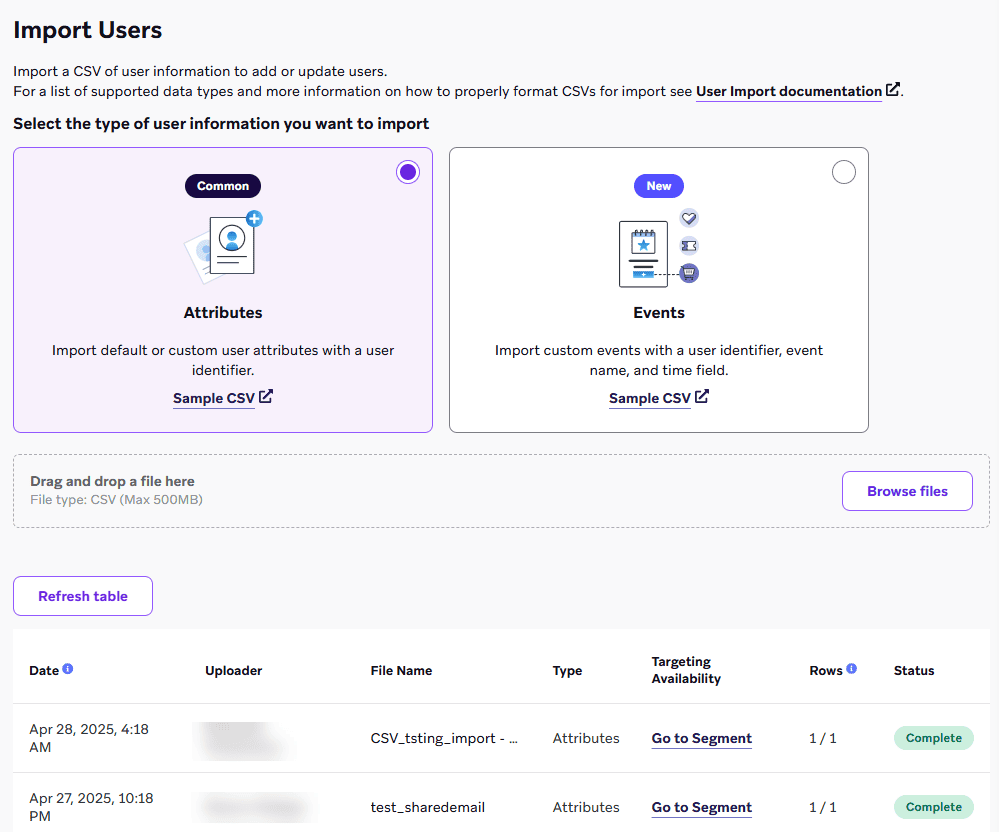 CSVユーザーインポートを開封するには、オーディエンス>ユーザーをインポートする。ここには、アップロード日、アップロード者の名前、ファイル名、ターゲットの有無、インポートされた行数、インポートのステータスなど、直近のインポートに関する詳細が一覧表示された表がある。