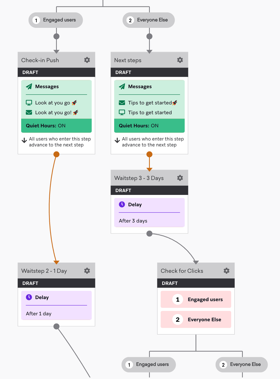 オーディエンスパスステップの完了後、各オーディエンスグループは個別の分岐を持ちます。オーディエンスパスを使用してオーディエンスをさらに絞り込むことも、標準のキャンバスステップを使用してキャンバスのジャーニーを続けることもできます。