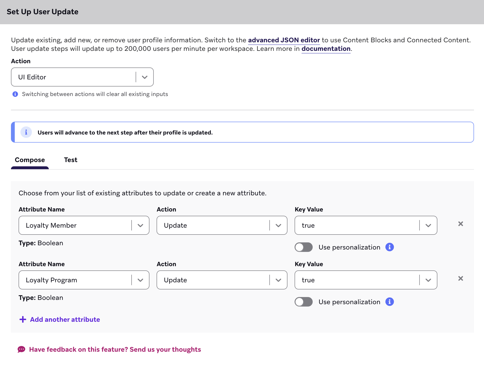 ユーザーの更新ステップでは、コネクテッドコンテンツの Liquid パーソナライゼーションを慎重に使用することをお勧めします。このステップタイプのレート制限は 1 分あたり 200,000 件です。このレート制限は、キャンバスのレート制限をオーバーライドします。
