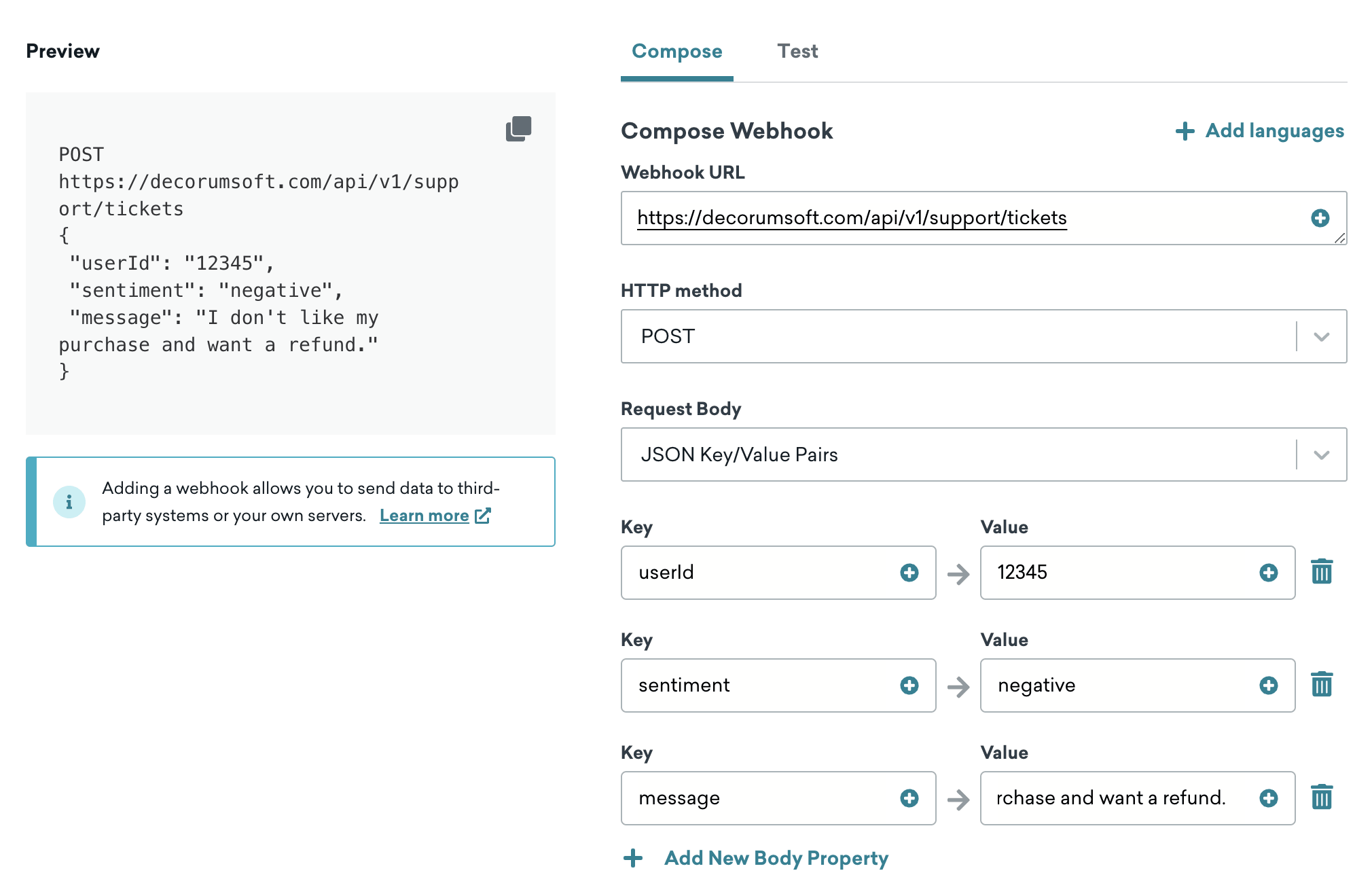 サポートケースの作成という名前のメッセージステップでは、テンプレートを更新して、購入した商品に満足できず返金を希望するユーザーを対象とする Webhook を作成します。