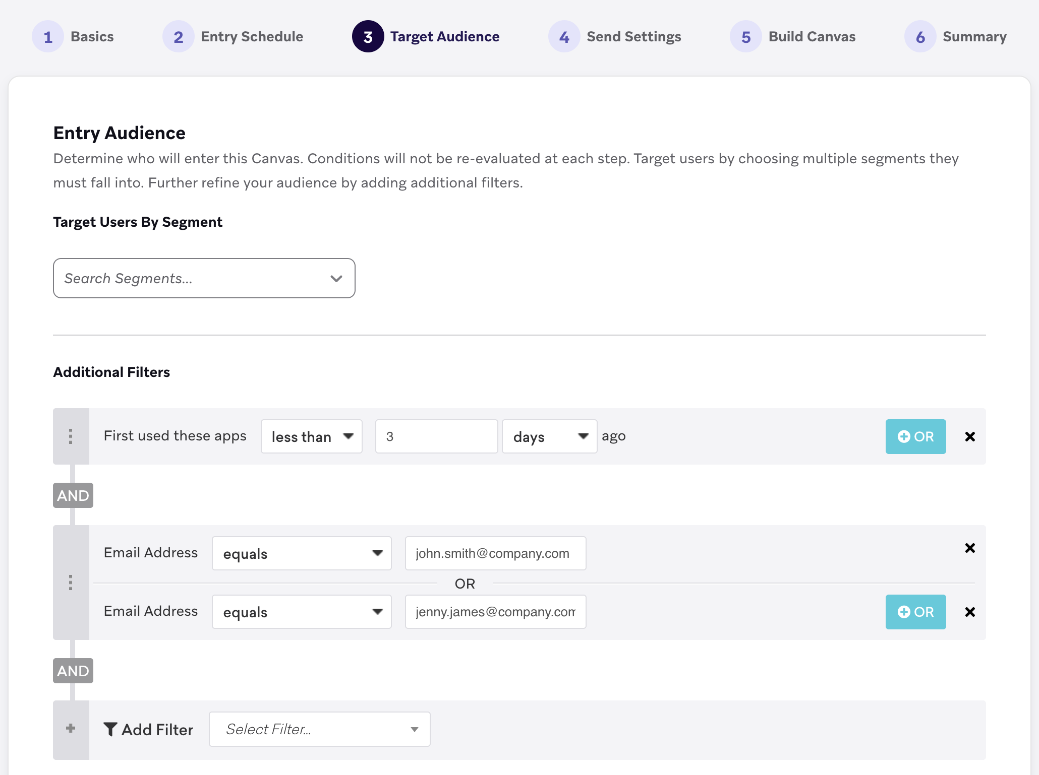 - 方法1:複製されたキャンバスで、キャンバスビルダーの [エントリオーディエンス] の部分を編集し、テストユーザーのみがキャンバスに適格になるようにします。また、メールアドレスのテストフィルターを追加することで、自分のメールアドレスをテストユーザーとして入力することもできます。以下の例では、キャンバスを、アプリを初めて使ってから 3 日以内の 2 人のテストユーザーに限定しています。