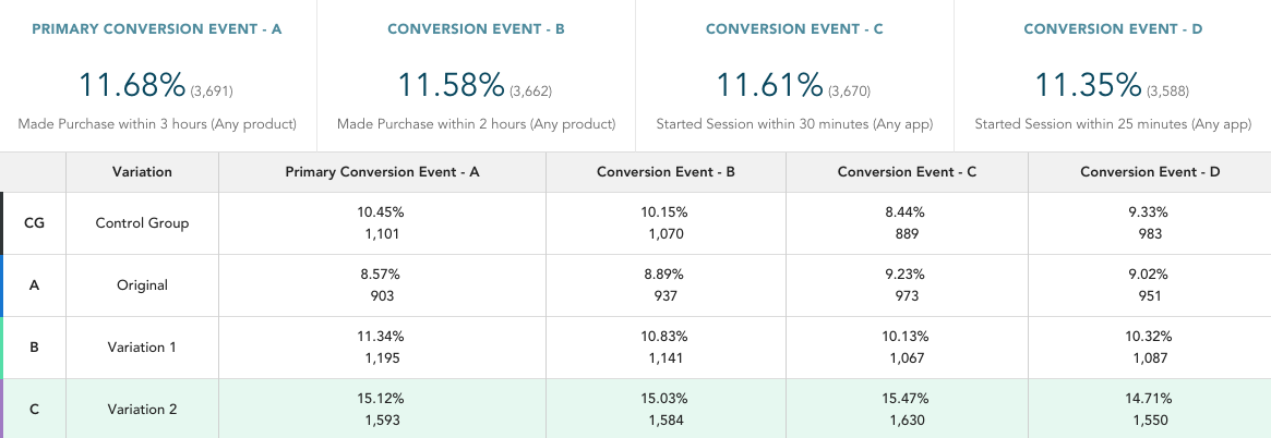 さらに、多変量分析メッセージの場合、コントロールグループと各バリアントのコンバージョン数とコンバージョン率を確認できます。