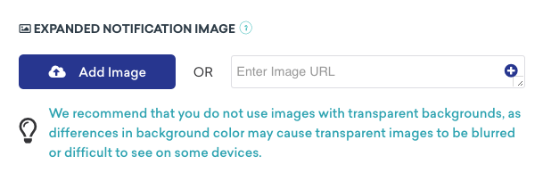 メッセージのコンポーザーにあるExpanded Notification Imageフィールドに画像を追加する。画像は、ダッシュボードから直接アップロードすることも、他の場所でホストされているコンテンツ URL を指定してアップロードすることもできます。