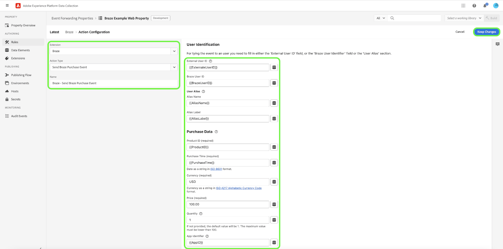 A ação Enviar evento de compra requer apenas a especificação de Product ID, Purchase Time, Currency e Price, mas você deve incluir o máximo de informações possível no campo de propriedades de compra. Consulte o objeto de compra para obter mais detalhes.